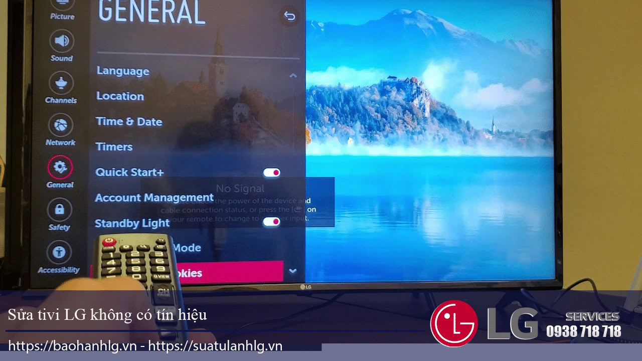 Troubleshooting LG TV with no signal, remote control in hand, highlighting professional LG TV repair services available for common issues like no picture or sound.